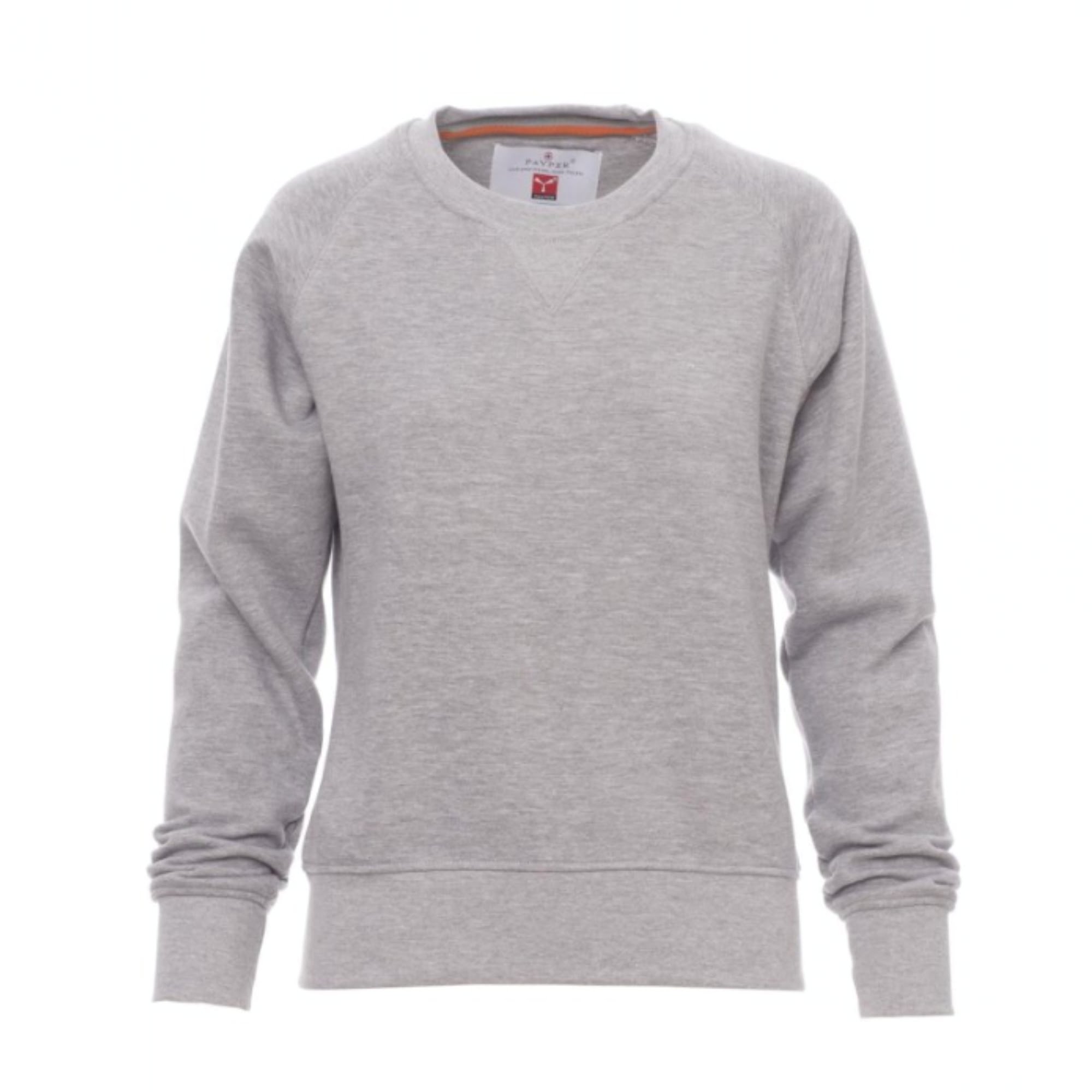 Felpa da donna girocollo, manica raglan, cucitura estetica a V al collo. Polsini e vita in costina elasticizzata, cuciture rinforzate.