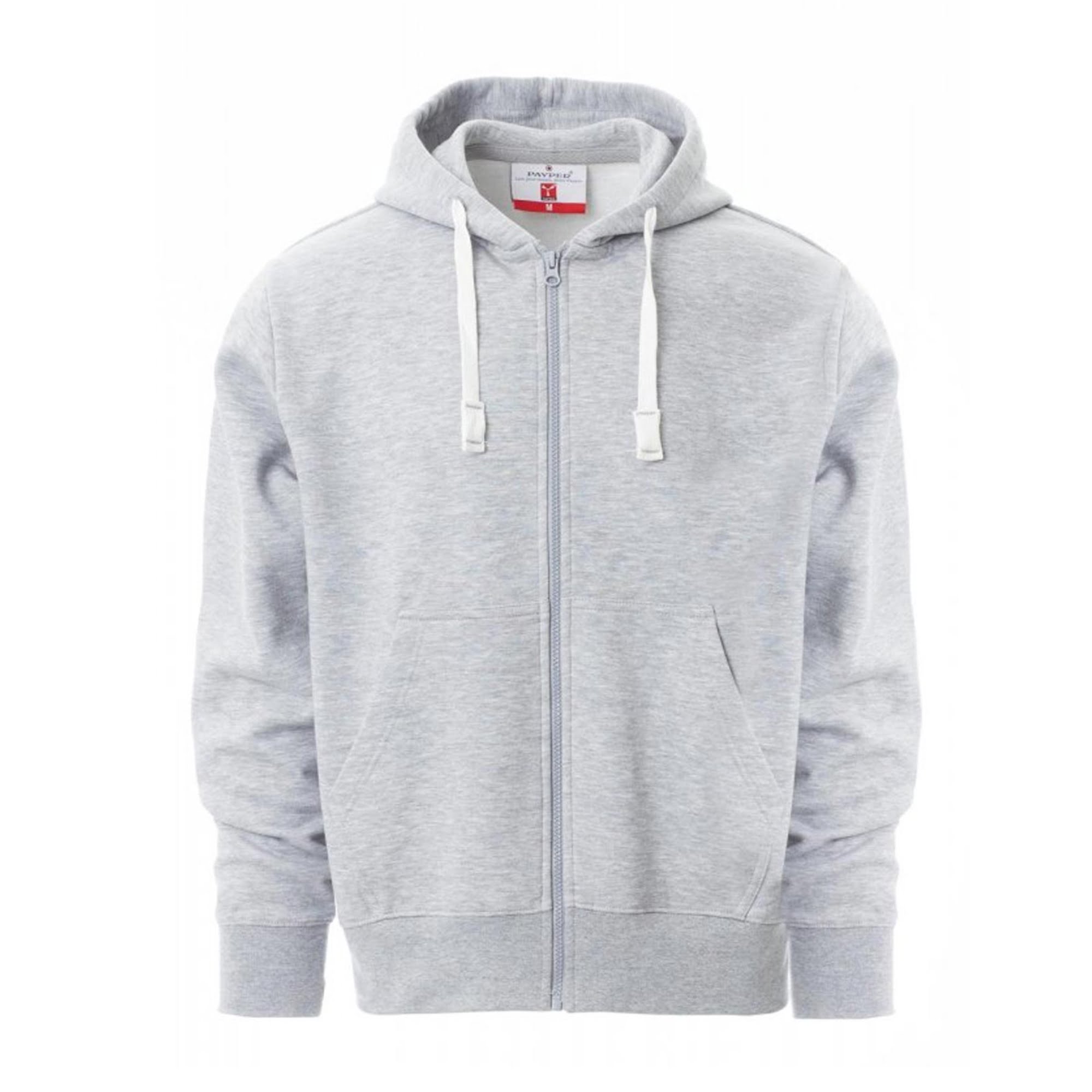 Felpa da uomo, zip intera in plastica a cursore singolo in metallo, cappuccio, coulisse in corda con cuciture in tinta con la felpa, manica a giro, tasche a marsupio, polsini e vita in costina elasticizzata. Cuciture rinforzate, nastro di rinforzo interno collo in tinta.
