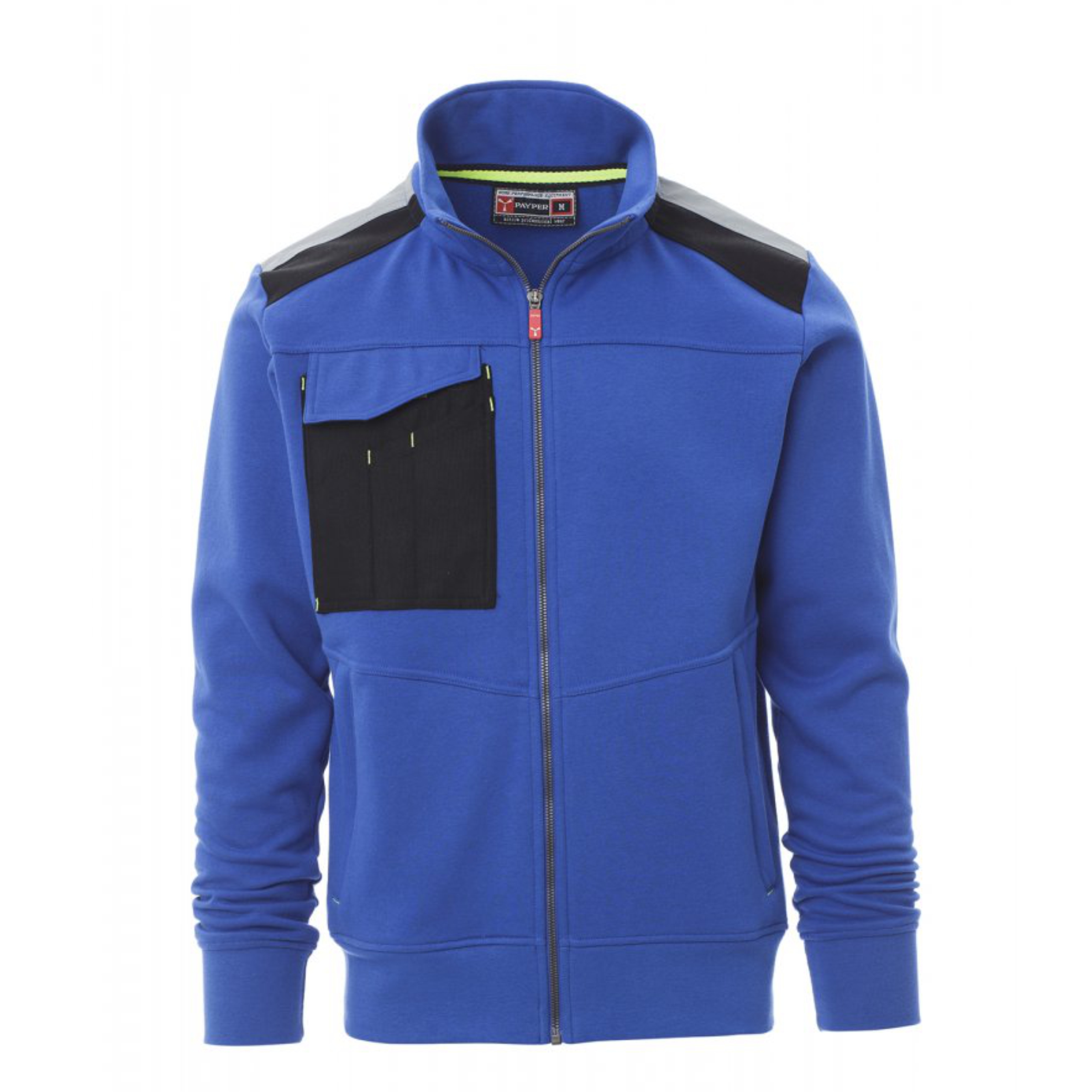 Felpa da uomo, zip intera SBS in plastica con cursore in metallo “semi-autolock”, due tasche con cerniera, una tasca multifunzione al petto con porta badge a scomparsa e patta di chiusura LOCK SYSTEM, bande riflettenti alle spalle, polsini e vita in costina elasticizzata, doppia cucitura al collo, alle maniche e in vita e nastro di rinforzo al collo. Trattamento del tessuto water repellent.