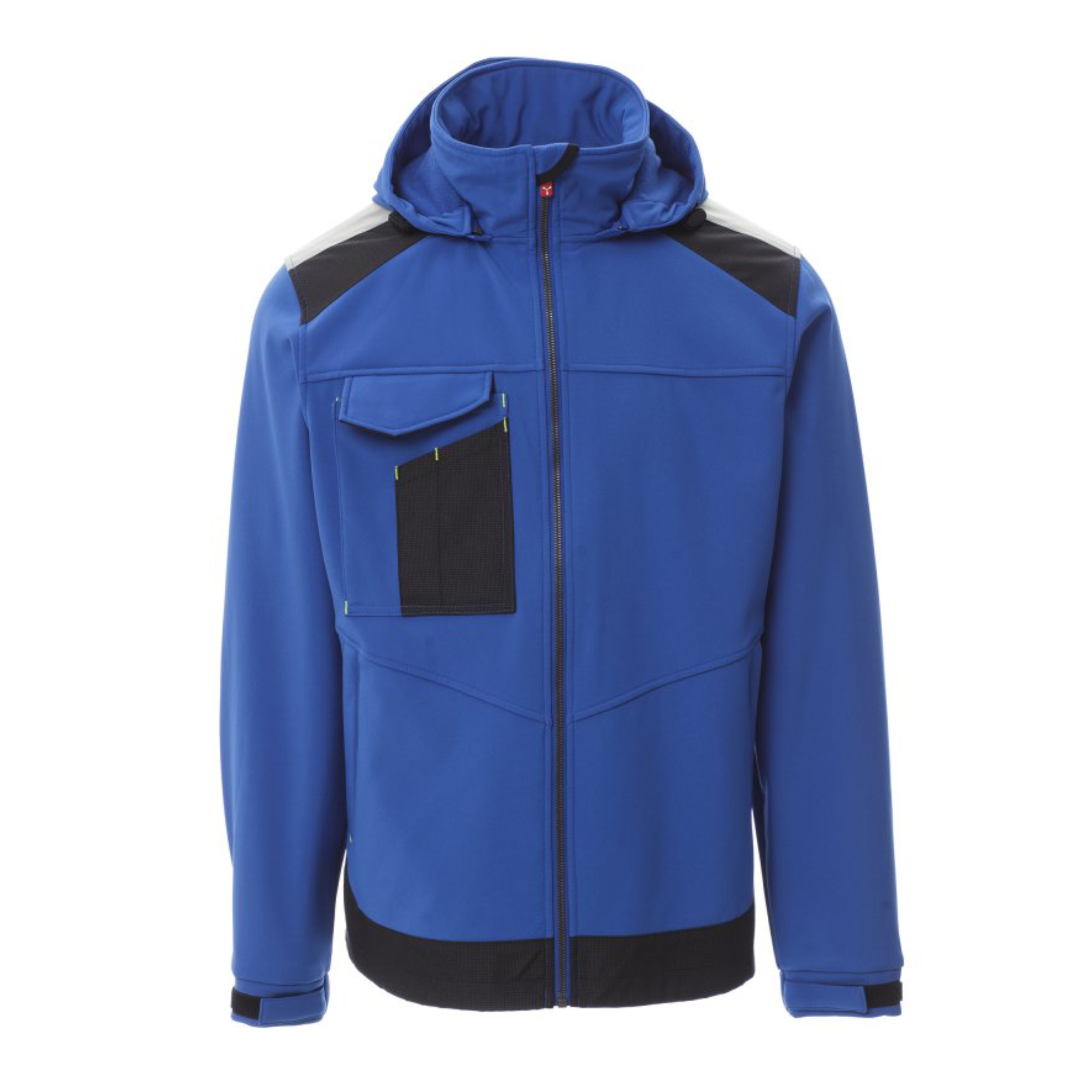 WP 8000 mm H₂O, WVT 5000 g/m² 24h. Giacca ergonomica da uomo, manica giro, zip intera SBS in plastica con cursore in metallo “semi-autolock”, due tasche laterali con cerniera, una tasca multifunzionale al petto con porta badge a scomparsa e patta di chiusura LOCK SYSTEM, bande riflettenti 3M alle spalle, elastico e stringipolso in velcro, cappuccio amovibile e con coulisse in elastico regolabile con stopper.