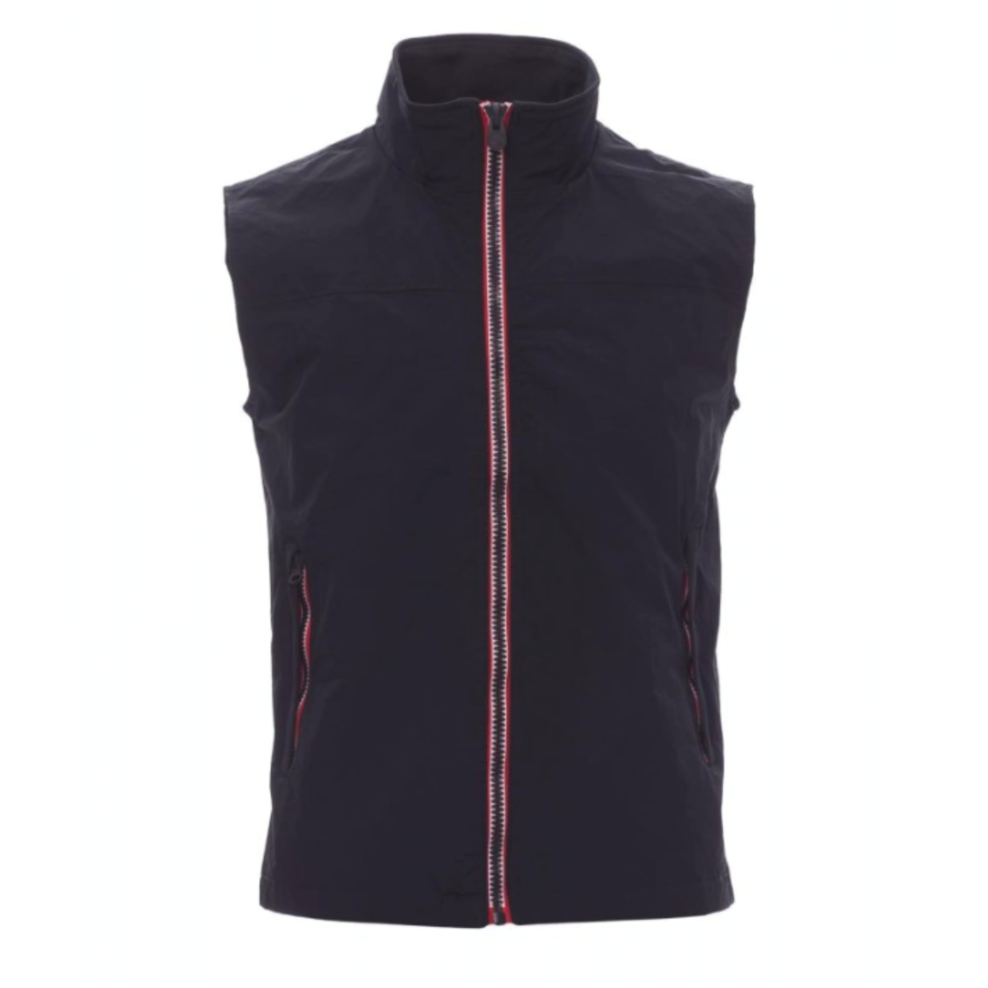 Gilet da uomo, zip da 8 mm a contrasto, due tasche esterne con zip coperta. Interno: non imbottito, retinato, una tasca con cerniera e predisposizione per cuffie e cavo smartphone zip al petto e sul fondo per agevolare stampe e ricami.