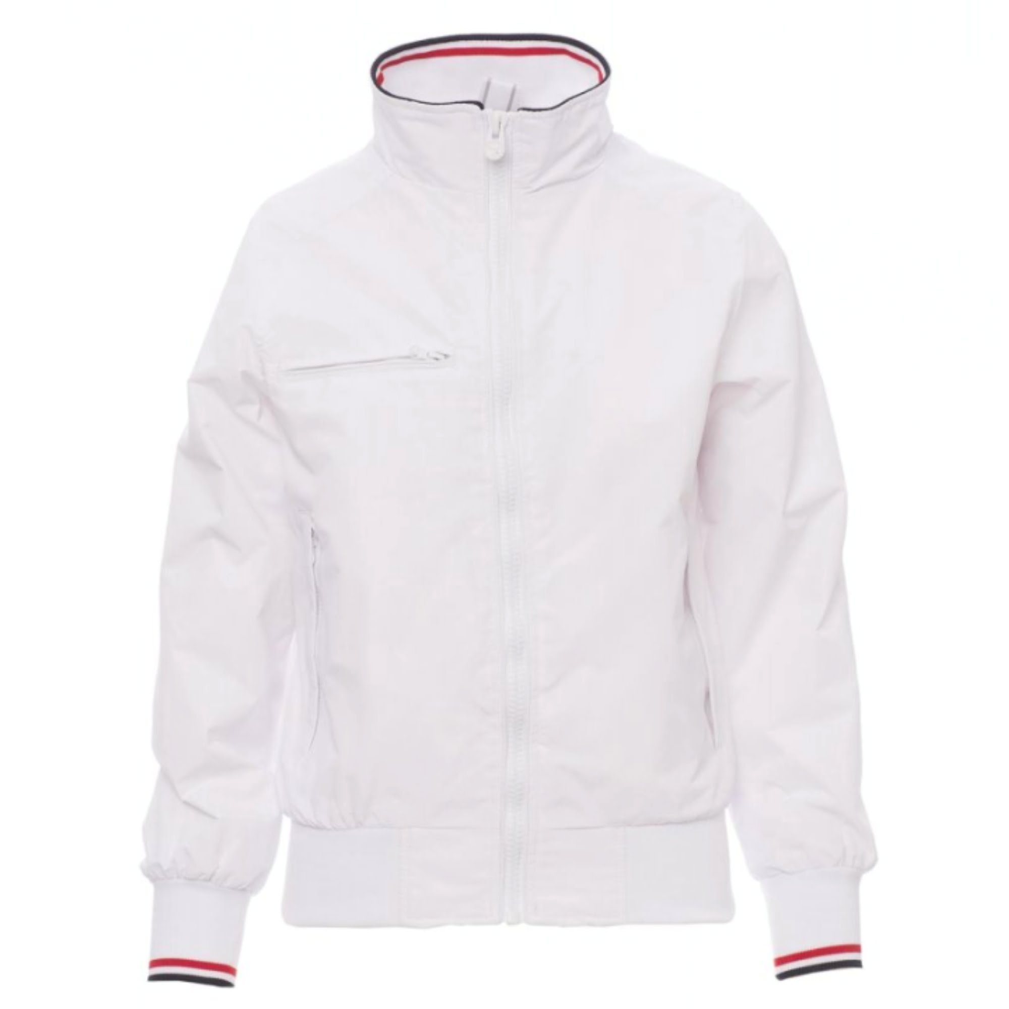 Giubbino ergonomico da donna, zip da 8mm, in plastica con cursore in metallo, con colletto, polsini e vita in rib elasticizzato con righe, due tasche esterne con zip in plastica. Interno non imbottito, retinato, una tasca con cerniera porta smartphone con predisposizione per cavo, zip al petto e schiena per agevolare stampe e ricami.