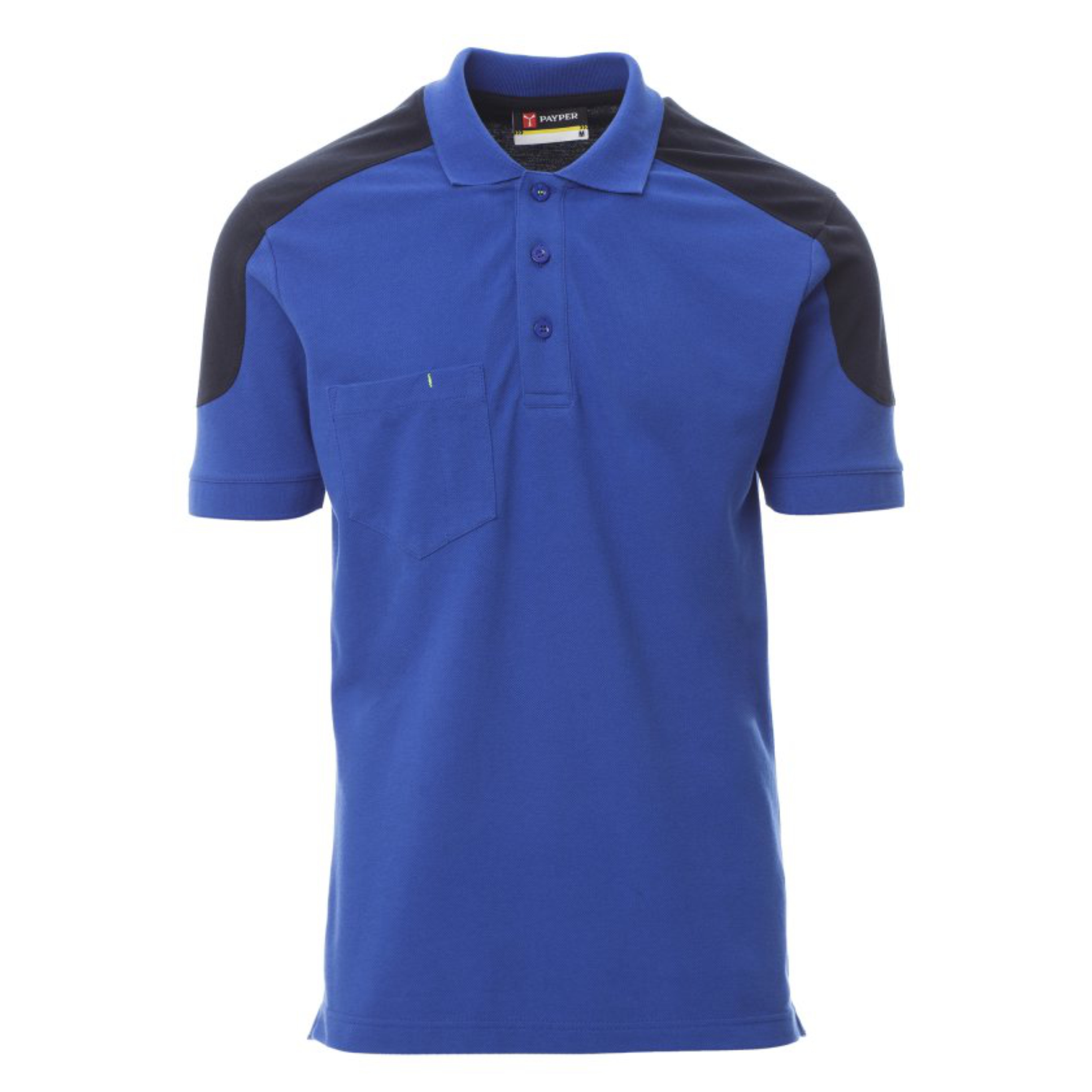 Polo bicolore a manica corta con 3 bottoni in tinta, taschino al petto con portapenna, bordo maniche a costine, spacchetti laterali, cuciture del collo coperte.