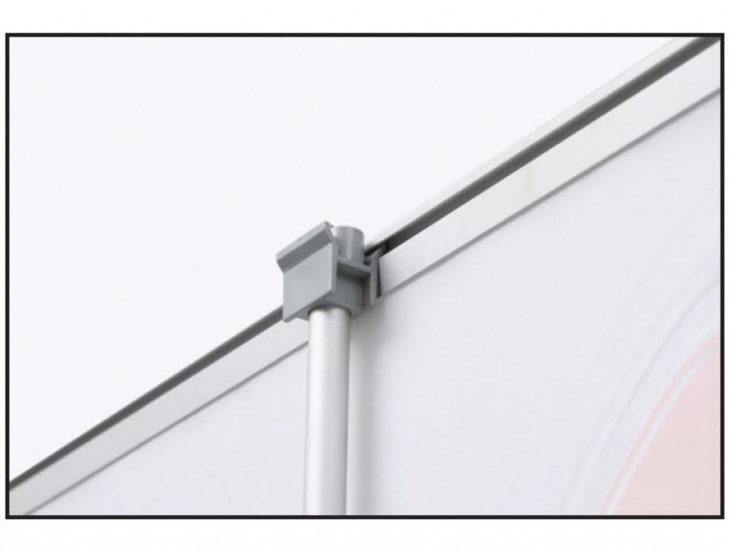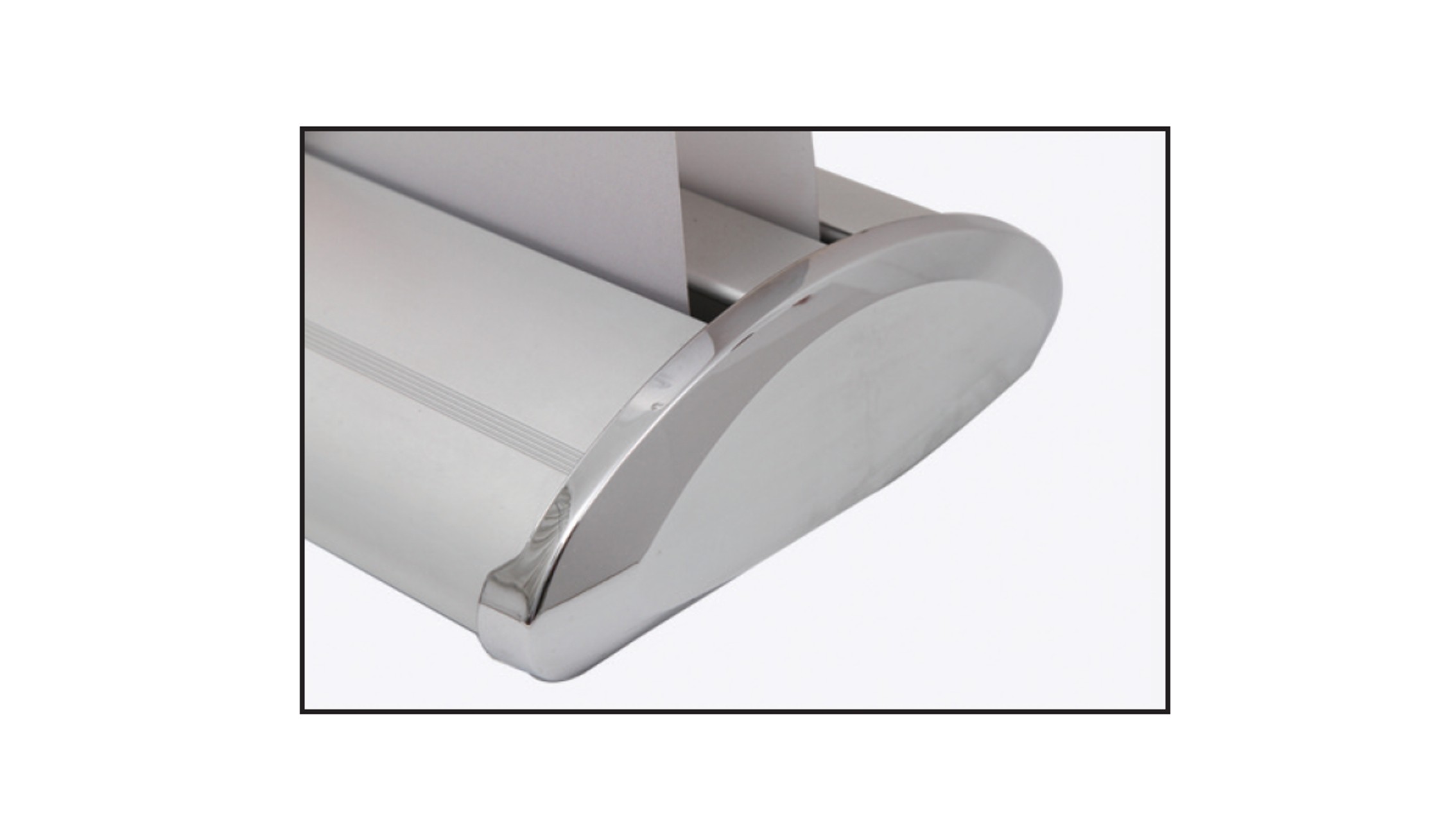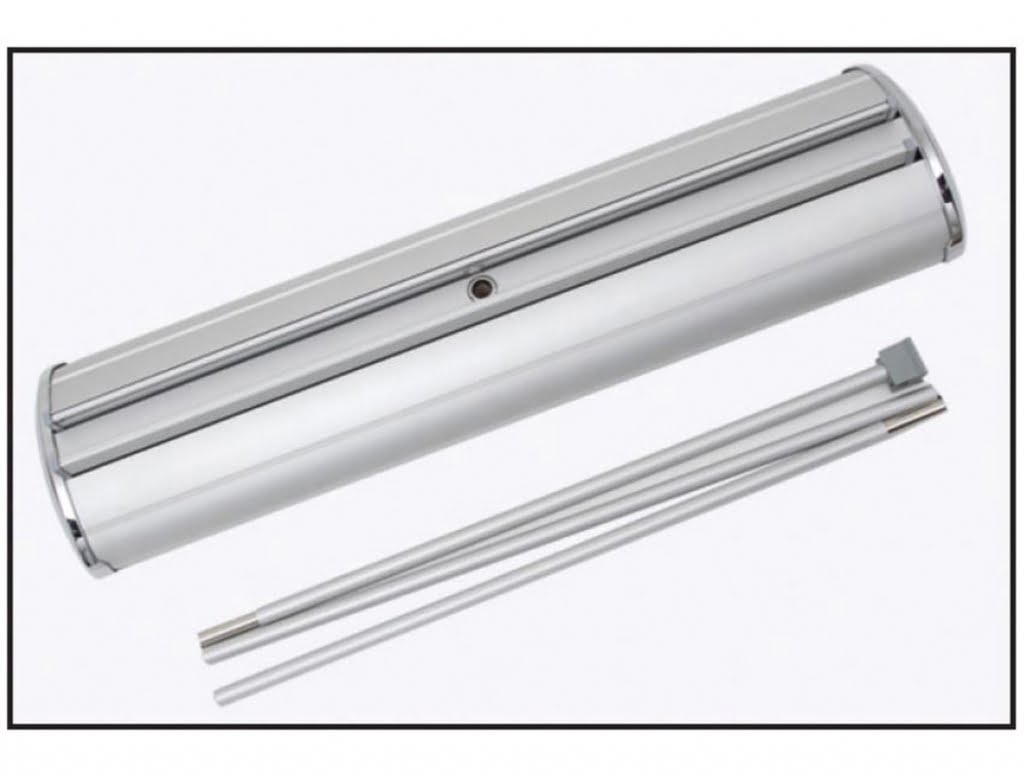 Roll-up bifacciale autoavvolgente in alluminio silver e finiture cromate, con piedini regolabili; fissaggio grafica superiore tramite barra con chiusura a pinza, inferiore con biadesivo.